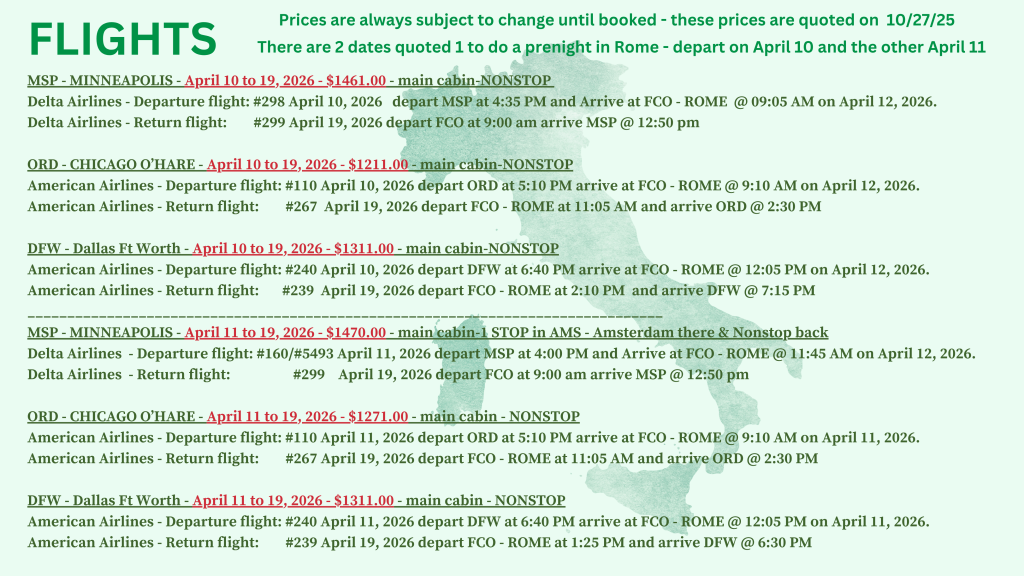 We will add flights once they are available from MSP/Minneapolis(or your airport) to YVR - Vancuouver Canada - for the same dates August 15, 2026 - August 22, 2026. These will probably need to be paid for when we book the flights.